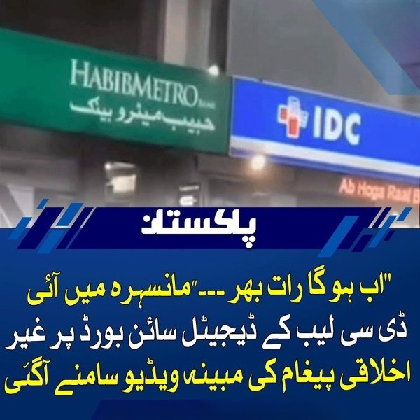 خیبرپختونخوا کے سیاحتی مقام مانسہرہ میں واقع اسلام آباد ڈائیگنوسٹک سینٹر (IDC) کی ایک برانچ کے باہر نصب ڈیجیٹل سائن بورڈ پر مبینہ طور پر غیر اخلاقی پیغام نشر ہونے کا انکشاف ہوا جس پر شہری شدید برہم ہو گئے۔