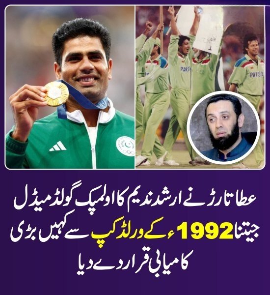 وفاقی وزیر اطلاعات و نشریات عطا تارڑ نے کہا ہے کہ ارشد ندیم کا اعزاز 92 کے ورلڈکپ سے کہیں بڑی کامیابی ہے۔ اسلام آباد میں پریس کانفرنس سے خطاب کرتے ہوئے انہوں نے کہا کہ پیرس اولپمکس میں گولڈ میڈل حاصل کرنے والے پاکستانی ایتھلیٹ ارشد ندیم کا اعزاز 1992ء کے ورلڈ کپ سے زیادہ ہے، انہیں ریاست کی جانب سے شاندار خراج تحسین پیش کیا جائے گا، وہ اہل خانہ کے ہمراہ ملتان سے خصوصی طیارے کے ذریعے کچھ دیر بعد نور خان ایئر بیس پر پہنچیں گے جہاں کابینہ کے ارکان قومی ہیرو کا استقبال کریں گے۔