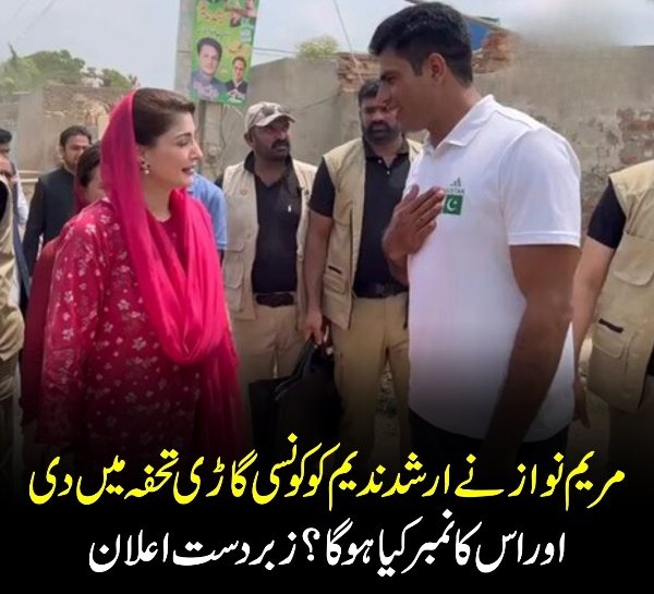 تفصیلات کے مطابق حکومت پنجاب کی جانب سے ارشد ندیم کو ’ ہونڈا سویک ‘ کا نیا ماڈل تحفے میں دیا گیا ہے اور اس حوالے سے ڈپٹی کمشنر نے اولمپکس میں کی گئی تاریخی تھرو کو مد نظر رکھتے ہوئے اعلان کیا کہ وزیراعلیٰ کی ہدایت پرارشد ندیم کو گاڑی کا رجسٹریشن نمبر’پی اے کے 9297‘ (PAK 9297) الاٹ کیا جائے گا ۔