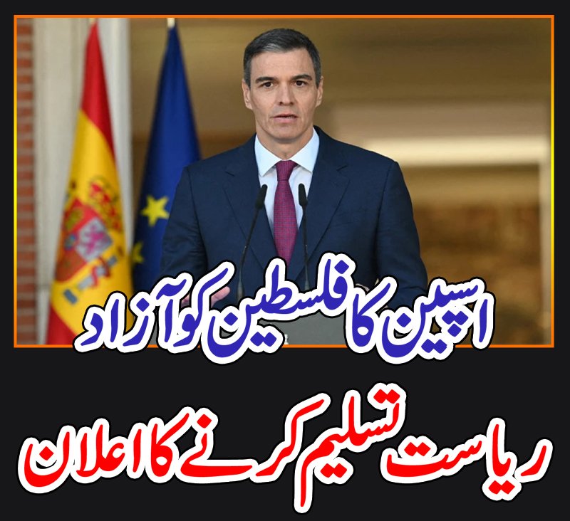 اسپین کے وزیراعظم پیڈرو سانچیز نے فلسطین کو باضابطہ آزاد ریاست تسلیم کرنے کا اعلان کر دیا۔غیر ملکی میڈیا کے مطابق اسپین کے وزیرِ اعظم پیڈرو سانچیز نے کہا ہے کہ فلسطین پر مظالم کی تاریخ میں مثال نہیں ملتی، امن کا قیام ہم سب کی ذمے داری ہے۔