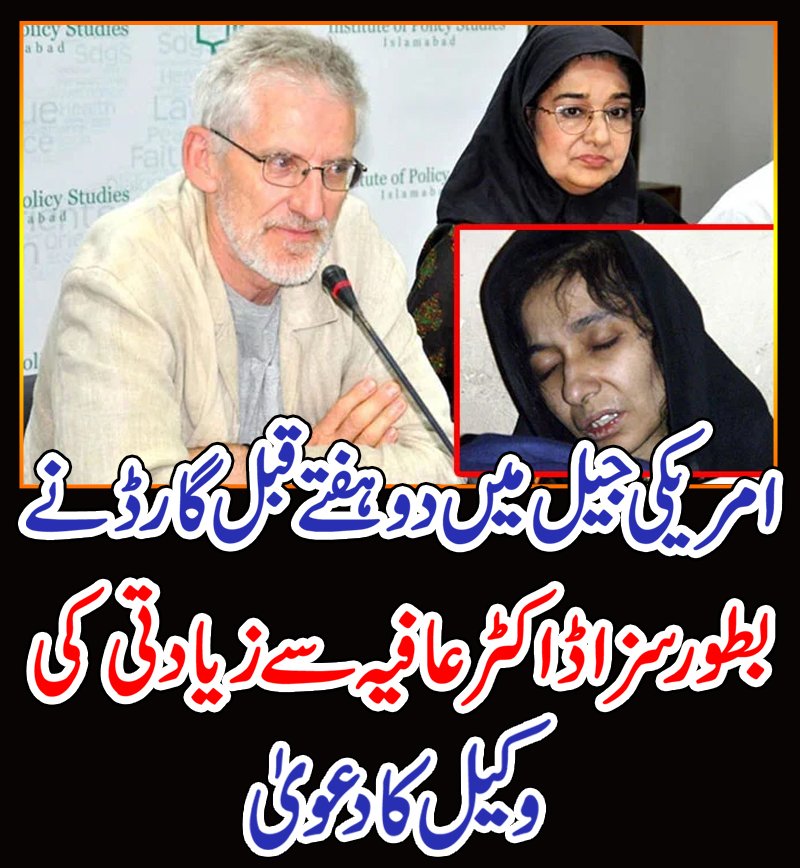 ڈاکٹر عافیہ صدیقی کے وکیل کلاؤ اسٹیفورڈ اسمتھ نے دعویٰ کیا ہے کہ ڈاکٹر عافیہ کو جیل میں ایک بار پھر جنسی زیادتی کا نشانہ بنایا گیا ہے۔ تفصیلات کے مطابق امریکا کی ریاست ٹیکساس کی فورٹ ورتھ جیل میں قید ڈاکٹرعافیہ کے بارے میں وکیل نے کہا کہ دو ہفتے پہلے ایک گارڈ نے ڈاکٹرعافیہ سے سزا کے طور پر زیادتی کی۔کلاؤ اسٹیفورڈ اسمتھ نے کہا ہے کہ امریکا کی فورٹ ورتھ جیل میں ڈاکٹر عافیہ صدیقی کو مسلسل جنسی ہراسانی کا نشانہ بنایا جا رہا ہے۔جیل میں ڈاکٹر عافیہ سے ملاقات کے بعد جیو نیوز سے ٹیلی فونک گفتگو کرتے ہوئے انہوں نے اس بات کا انکشاف کیا کہ ڈاکٹر عافیہ کے ساتھ جنسی زیادتی کا سلسلہ ابھی رکا نہیں ہے، جیل میں اب بھی ان کو ریپ اور مسلسل جنسی ہراسانی کا نشانہ بنایا جا رہا ہے۔