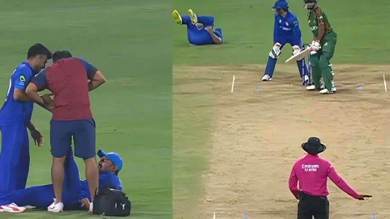 ان کے اوور میں تقریبا تیسری اور چوتھی بال کے درمیان افغان فاسٹ بائولر گلبدین نائب جو کہ فرسٹ سلپ میں فیلڈنگ کررہے تھے وہ اچانک اپنی ٹانگ کے پچھلے حصے کو پکڑ کر نیچے گر گئےکہ جیسے انہیں اچانک ٹانگ میں شدید درد اٹھا ہو۔