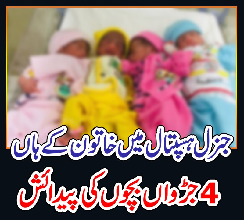 جنرل ہسپتال میں جمعرات کے روز خاتون کے ہاں 4 جڑواں بچوں کی پیدائش ہوئی، جن میں 2 بیٹیاں اور 2 بیٹے شامل ہیں۔ گائنا کالوجسٹ ڈاکٹر لیلیٰ شفیق کے مطابق 25 سالہ حنا پطرس کو گزشتہ روز تشویش ناک حالت میں ایل جی ایچ گائنی وارڈ میں لایا گیا جہاں ڈیوٹی پر موجود ڈاکٹر خالدہ اور ڈاکٹر عائشہ ملک نے طبی معائنہ کرنے کے بعد مریضہ کو بلا تاخیر زندگی بچانے والی ضروری ادویات دے کر علاج معالجہ شروع کیا اوربڑے آپریشن سے 4 بچے پیدا ہوئے جو اپنی ماں سمیت رو بصحت ہیں ۔