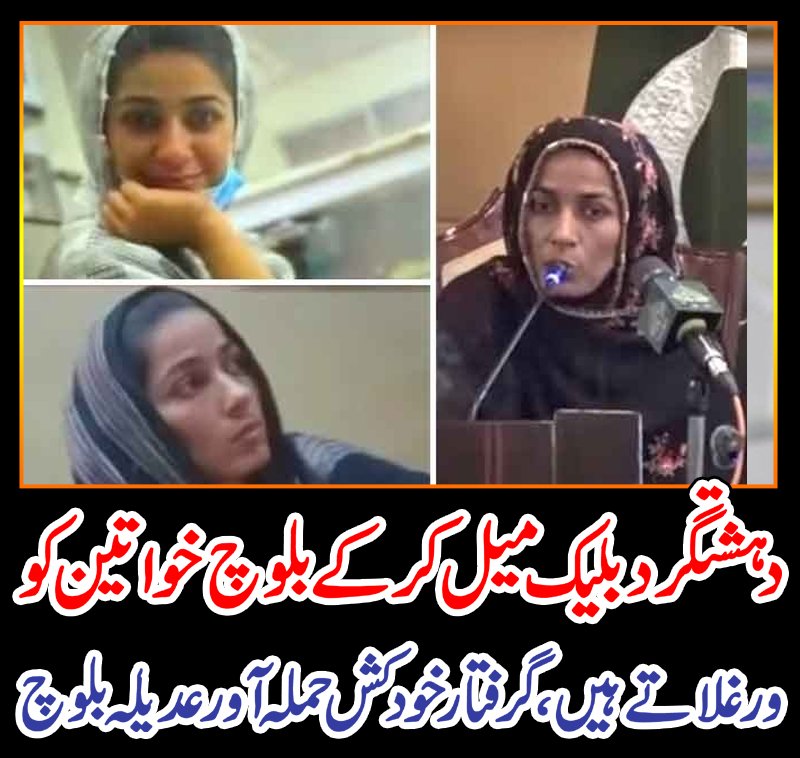 لوچستان کے علاقہ تربت سے گرفتار خودکش بمبار خاتون عدیلہ بلوچ نے کہا ہے کہ ان کی برین واشنگ کی گئی اور ورغلایا گیا۔ والدین کے ہمراہ پریس کانفرنس کرتے ہوئے خودکش بمبار خاتون نے کہا کہ انہوں نے اپنی ابتدائی تعلیم تربت سے حاصل کی اور کوئٹہ سے نرسنگ کا کورس کیا۔