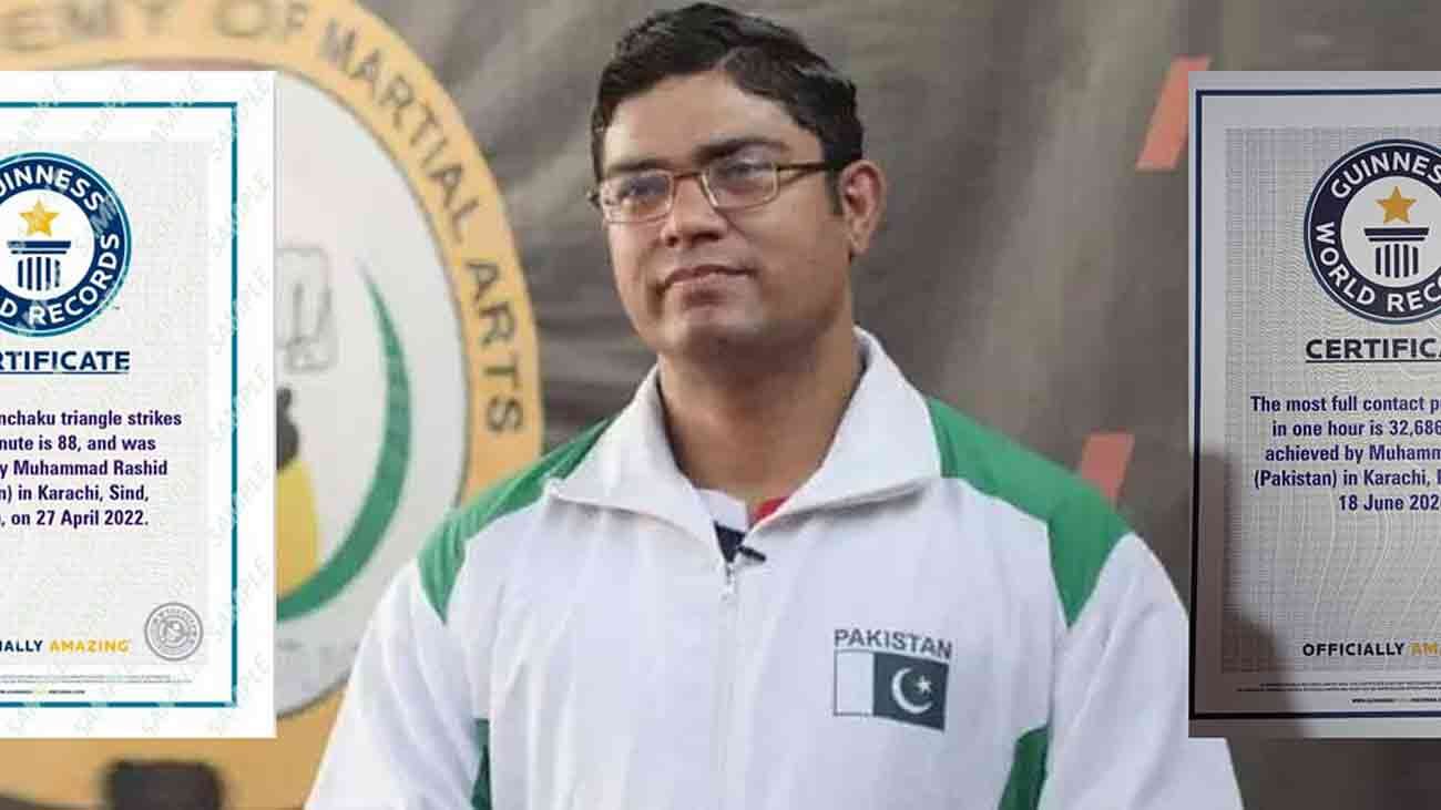 پاکستانی مارشل آرٹسٹ محمد راشد نسیم نے صرف 30 سیکنڈ میں اپنے سر سے 39 کین توڑ کر اپنا 101 واں عالمی ریکارڈ بنا لیا ہے۔ اس متاثر کن کارنامے کو گنیز بک آف ورلڈ ریکارڈ نے ایک ویڈیو میں شیئر کیا، جس میں راشد کی شاندار صلاحیتوں اور عزم کا اظہار کیا گیا۔