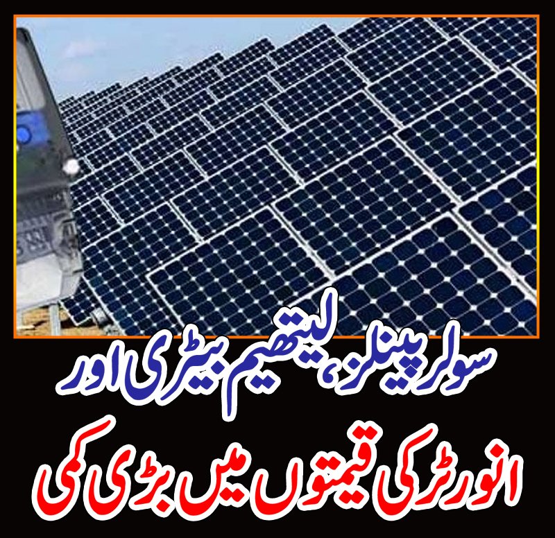 سولر پینلز، لیتھیم بیٹری اور انورٹر کی قیمتیں کم ہوگئیںسولر پینلز ایسوسی ایشن کے عہدیداروںکے مطابق سولر پینلز کی فی واٹ قیمت کم ہو کر 35 روپے ہوگئی۔لیتھیم بیٹری کی قیمت بھی عالمی سطح پر ایک ماہ میں 10 فیصد کم ہوئی ہے ۔عہدیداروں کے مطابق انورٹر پر کوئی ٹیکس نہیں لگا، اس کی قیمت میں بھی 10 فیصد کمی آئی ہے۔