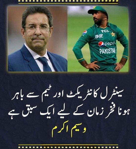 قومی ٹیم کے سابق کپتان وسیم اکرم کا کہنا ہے کہ سینٹرل کانٹریکٹ اور ٹیم سے باہر ہونا فخر زمان کے لیے ایک سبق ہے۔ سابق کپتان پاکستان کرکٹ ٹیم وسیم اکرم نے میلبورن میں آن لائن پریس کانفرنس کے دوران کہا کہ فخر زمان امپیکٹ پلئیر ہے، مجھے یقین ہے کہ سوشل میڈیا بیان فخر زمان نے نہیں لکھا، جس نے بھی لکھا اسے بتانا چاہیے تھا کہ سینٹرل کنٹریکٹ کی وجہ سے آپ کو مسئلہ ہو سکتا ہے، میں سمجھتا ہوں کہ یہ فخر زمان کے لیے ایک سبق ہے، سوچ سمجھ کر سوشل میڈیا پر لکھنا چاہیے، پی سی بی کا اس معاملے پر اپ سیٹ ہونا بنتا تھا۔