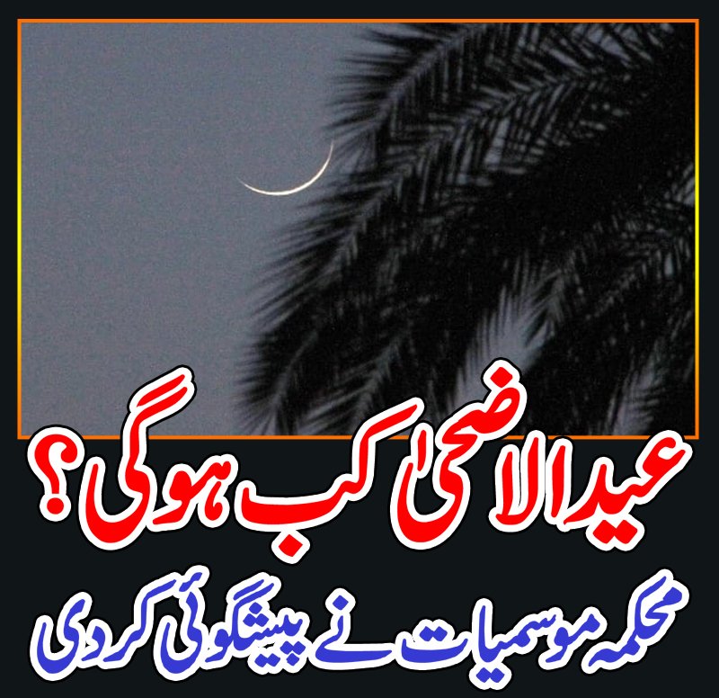 محکمہ موسمیات نے عید الاضحی 17جون بروز پیر کو ہونے کی پیشگوئی کر دی۔تفصیلات کے مطابق کلائیمنٹ ڈیٹا پروسیسنگ سینٹر نے پیشگوئی کی ہے کہ ذوالحج کا چاند 7جون بروز جمعہ کو نظر آنے کا قوی امکان ہے اور عید الضحی 17جون بروز پیر کو ہوگی۔