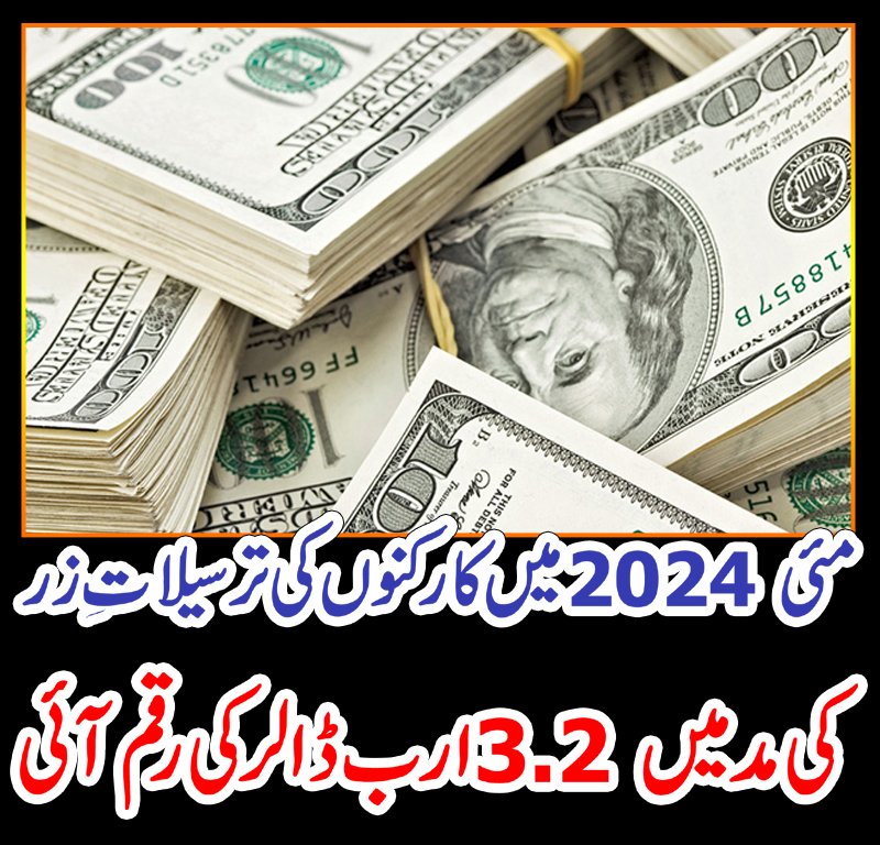 مئی2024 میں کارکنوں کی ترسیلاتِ زر کی مد میں 3.2 ارب ڈالر کی رقم آئی۔اسٹیٹ بینک کے مطابق نمو کے لحاظ سے مئی 2024 کے دوران ترسیلاتِ زر میں ماہ بماہ بنیاد پر 15.3 فیصد اضافہ اور سال بسال بنیاد پر 54.2 فیصد اضافہ ہوا۔