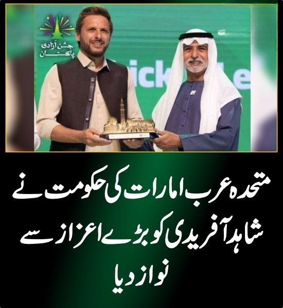 متحدہ عرب امارات حکومت نے قومی کرکٹ ٹیم کے سابق کپتان شاہد آفریدی سمیت متعدد پاکستانی شخصیات کو ’یوم آزادی ایوارڈ‘ سے نواز دیا۔ ڈیلی پاکستان گلوبل کے مطابق پاکستان کے 77ویں یوم آزادی کے موقع پر متحدہ عرب امارات میں ایک شاندار تقریب کا انعقاد کیا گیا، جس میں مختلف شعبوں میں نمایاں خدمات سرانجام دینے والی پاکستانی شخصیات کو یوم آزادی ایوارڈ دیا گیا۔