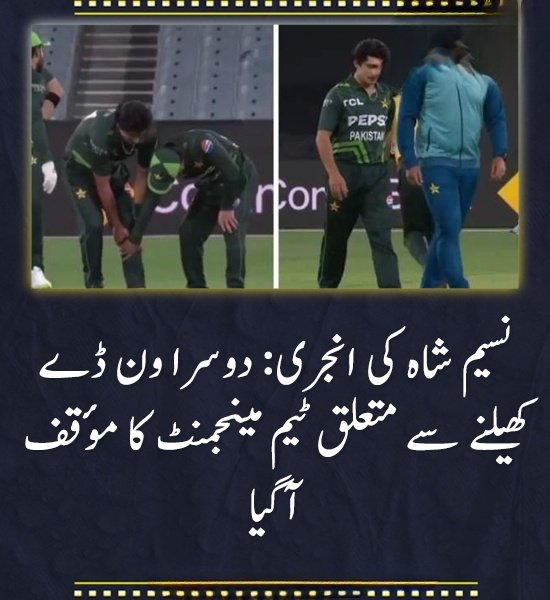 پاکستان کرکٹ ٹیم کے فاسٹ بولر نسیم شاہ کی انجری سے متعلق ٹیم ذرائع کا کہنا ہے کہ فاسٹ بولر کی انجری تشویش ناک نہیں، اگلے میچ تک فٹ ہو جائیں گے۔ ٹیم ذرائع کے مطابق نسیم شاہ کے کریمپس پڑے ہیں، مگر اگلے میچ میں وقت ہے، جب تک وہ مکمل فٹ ہوجائیں گے۔ فاسٹ بولر کو میلبورن میں آسٹریلیا کے خلاف پہلے ون ڈے میچ کے دوران بولنگ کے دوران کریمپس پڑ گئے تھے، جس کے باعث وہ اپنا آٹھواں اوور مکمل نہ کر سکے تھے اور گراؤنڈ سے باہر چلے گئے تھے۔