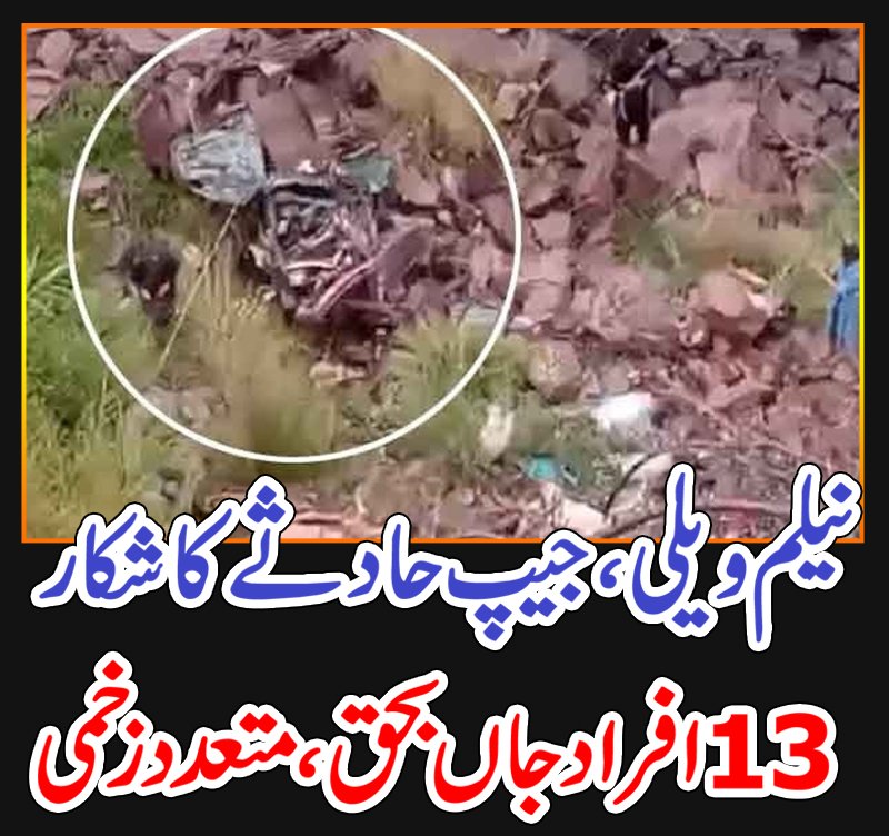 نیلم ویلی شاہراہ دیولیاں کے مقام پر وادی نیلم کے علاقے لبات بالا سے مظفرآباد جانے والی مسافر جیپ نمبر این ڈبلیو ایف پی ـ9667گہری کھائی میں جا گری جس کے نتیجے میں 13 افراد جاں بحق اور پانچ زخمی ہوگئے۔صدر پاکستان و وزیراعظم پاکستان ،سپیکر قومی اسمبلی ،چیئرمین سینیٹ ،وزیراعلی پنجاب ،وزیر داخلہ ،صدر ریاست اور وزیراعظم آزاد کشمیر نے جیپ کے حادثے پر گہرے رنج وغم کا اظہار کرتے ہوئے جاں بحق افراد کیلئے دعائے مغفرت اور لواحقین کیلئے صبر جمیل کی دعا کیـریسکیو حکام کے مطابق جیپ گہری کھائی میں گرنے سے ڈرائیور سمیت 13 افراد موقع پر دم توڑ گئے، جاں بحق ہونے والوں میں 6 مرد، 4 خواتین اور 3 بچے شامل ہیں۔زخمیوں کو بی ایچ یو پٹہکہ میں منتقل کر دیاگیا ـعینی شاہدین کے مطابق حادثہ مقامی وقت کے مطابق صبح دس بجے کے قریب پیش آیاـحادثے میں تین مقامی خواتین بھی زخمی ہوئیں جو گھاس کی کٹائی میں مصروف تھیں