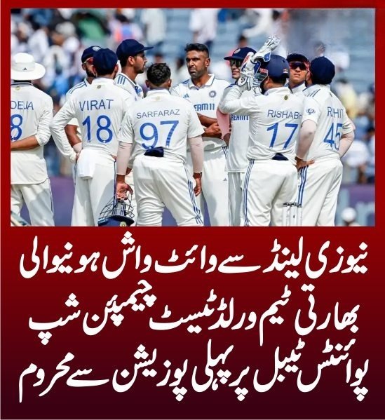 نیوزی لینڈ کیخلاف وائٹ واش ہونیوالی بھارتی ٹیم ورلڈ ٹیسٹ چیمپئن شپ پوائنٹس ٹیبل پر پہلی پوزیشن سے محروم
