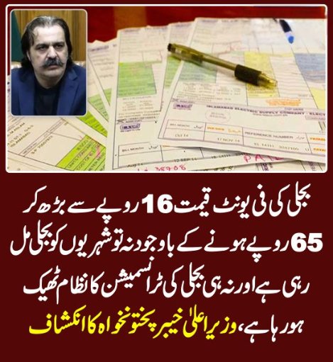 علی امین گنڈ اپور نے اس بات پر افسوس کا اظہار کیا کہ بجلی کی فی یونٹ قیمت 16 روپے سے بڑھ کر 65 روپے ہونے کے باوجود نہ تو شہریوں کو بجلی مل رہی ہے اور نہ ہی بجلی کی ٹرانسمیشن کا نظام ٹھیک ہو رہا ہے،صوبے میں لائن لاسز کے ذمہ دار وفاقی حکومت اور پیسکو ہیں جبکہ اس کی سزا صوبے کے عوام کو دی جارہی ہے جو کسی صورت قابل قبول نہیں ہے۔ وزیراعلیٰ نے کہاکہ صوبائی حکومت بجلی کے بقایا جات کی ریکوری اور میٹرنگ کے سلسلے میں بھی وفاقی حکومت کو تعاون فراہم کرنے کیلئے تیار ہے جبکہ بجلی سے جڑے معاملات پر آگے بڑھنے کیلئے وفاقی وزیر توانائی کو وزیراعلیٰ ہائوس آنے کی دعوت دی گئی ہے۔