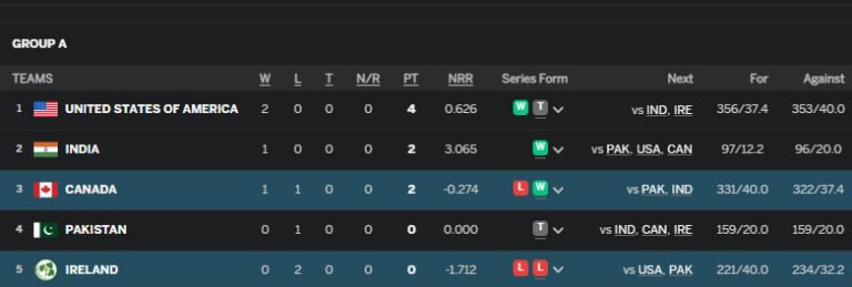 نیکولس کیرٹن پلیئر آف دی میچ قرارپائے،گروپ اے کے اس میچ کے بعد پوائنٹس ٹیبل پر امریکہ پہلے ، بھارت دوسرے ، کینیڈا تیسرے ، پاکستان چوتھے اور آئرلینڈ پانچویں نمبر پر براجمان ہے ۔