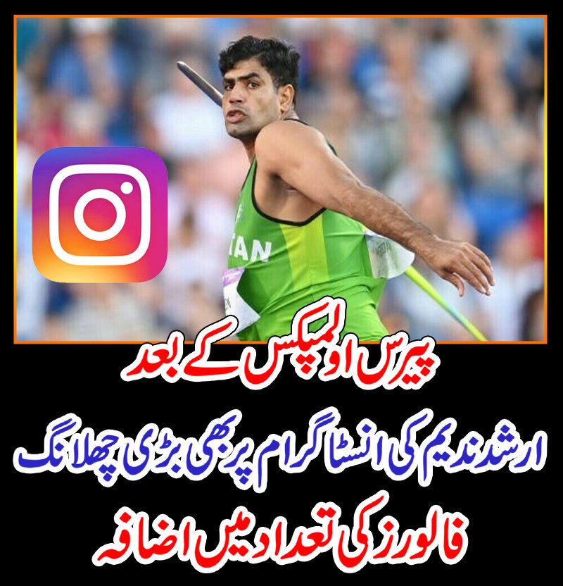پیرس اولمپکس 2024ء میں گولڈ میڈل جیت کر پاکستانیوں کے چہروں پر خوشی کے رنگ بھرنے والے ارشد ندیم نے انسٹاگرام پر بھی لمبی ترین چھلانگ لگائی ہے۔فوٹو اینڈ ویڈیو ایپلیکیشن انسٹاگرام پر 24 گھنٹوں کے دوران ارشد ندیم کے فالوورز کی تعداد میں ہوشربا اضافہ ہوا ہے۔
