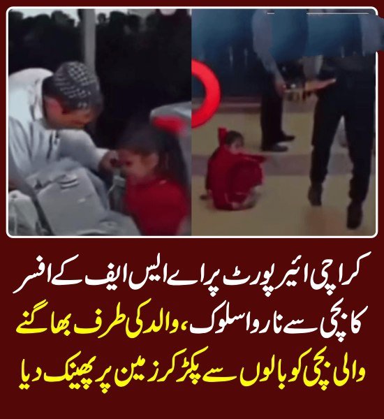 ایئرپورٹ سیکیورٹی افسر نے بیرون ملک سے پرواز کی آمد کے موقع پر بچی کے اپنے والد کی طرف بھاگنے کے دوران افسر نے بچی کی بالوں سے پکڑ کر فرش پر پھینکا۔