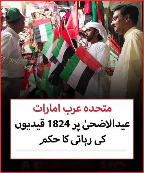 عیدالاضحیٰ کے پرمسرت موقع پر متحدہ عرب امارات کے صدر اور نائب صدر کی جانب سے 1824 قیدیوں کی رہائی کا حکم دیا گیا ہے۔