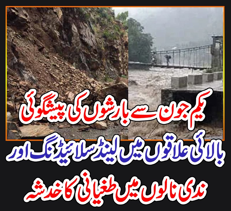 نیشنل ڈیزاسٹر مینجمنٹ اتھارٹی (این ڈی ایم اے) کے مطابق یکم جون تک ملک کے بالائی علاقوں میں گردوغبار، آندھی اور گرج چمک کیساتھ بارشیں متوقع ہیں۔ ترجمان این ڈی ایم اے کے مطابق متعلقہ اداروں کو ممکنہ بارشوں اور آندھی سے محتاط رہنے کا الرٹ جاری کردیا گیا ہے، بالائی علاقوں میں لینڈسلائیڈنگ سے ٹریفک کا نظام متاثر ہوسکتا ہے ،مقامی ندی نالوں میں طغیانی کا خدشہ ہے۔