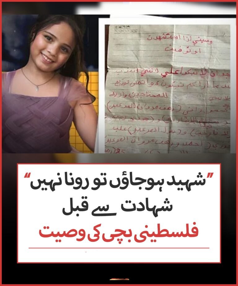 بچی نے وصیت میں لکھا کہ میری مرضی اگر میں شہید ہوجاؤں میرے لیے رونا …