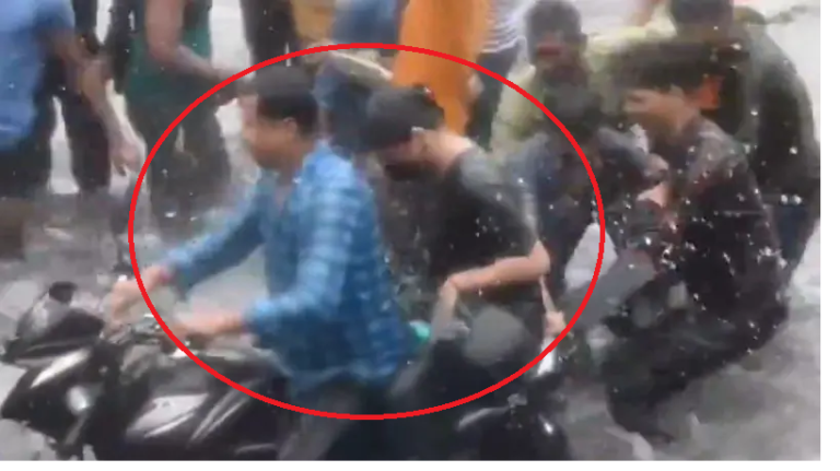لکھنؤ کے گومتی نگر علاقے میں موسلادھار بارش کے درمیان موٹر سائیکل سوار نوجوان اور …